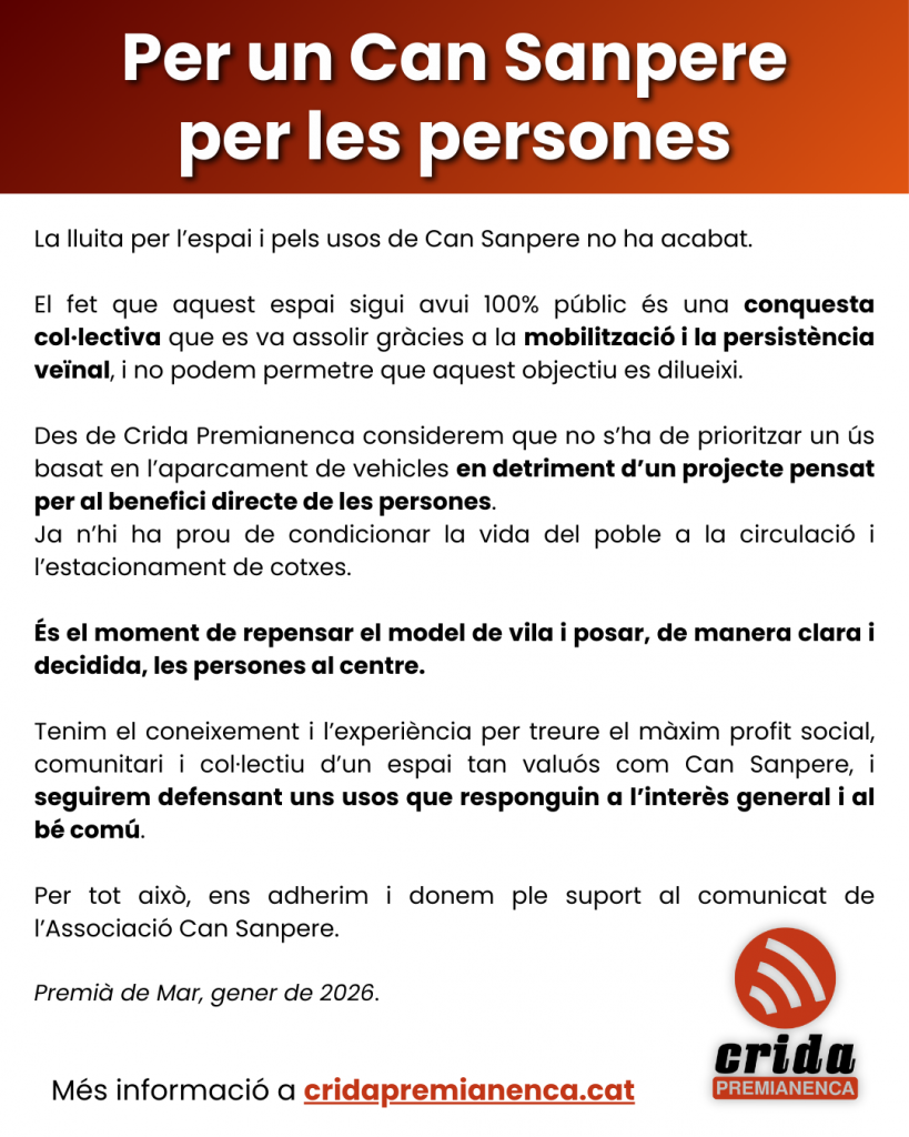 Per un Can Sanpere per les persones23 de gener de 2026 1 d’octubre 2017-2025. Memòria i perspectiva30 de setembre de 2025 Onze de setembre. Amb l’internacionalisme per la sobirania, l’autodeterminació i la unitat popular10 de setembre de 2025