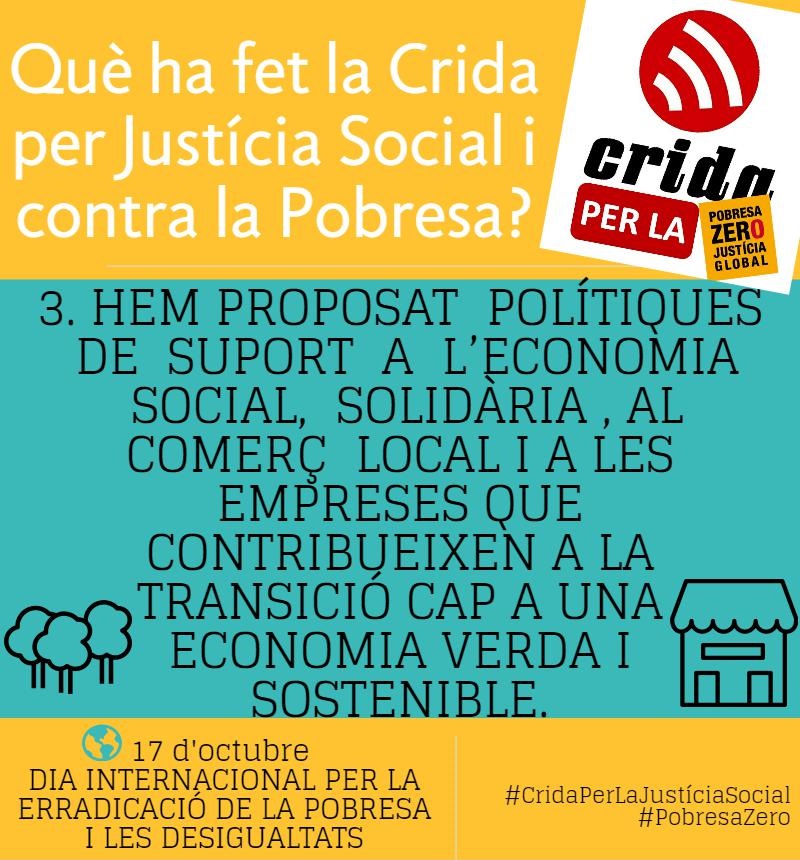 A casa nostra es fa evident que cal continuar treballant per erradicar la pobresa i les desigualtats, ja que malauradament les vulneracions de drets i l’exclusió social són realitats existents a Catalunya. Aquesta situació posa de manifest la necessitat d’un canvi de model econòmic, social i polític dirigit cap a la justícia global, la qual té per objectiu la transformació de les relacions de poder que generen desigualtats, mitjançant, entre d’altres, la redistribució dels béns i l’educació per una ciutadania global. Veiem amb preocupació com els postulats neoliberals continuen desballestant l’Estat del Benestar, cada cop més limitat i amb menys capacitat per reduir les creixents desigualtats, el que suposa renunciar progressivament a la responsabilitat pública de garantir els drets de les persones. Es trenca així, de manera inadmissible, el pacte social existent, amb tot el que això suposa.