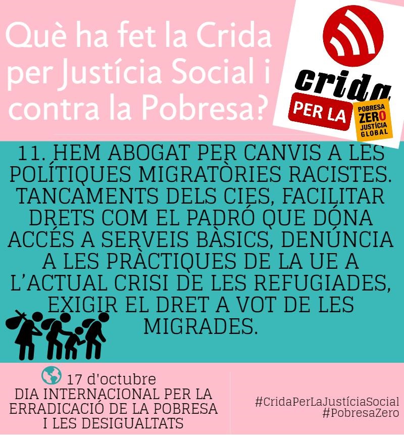 El 17 d’octubre va ser el el Dia Internacional a favor de l’Erradicació de la Pobresa. Amb aquest motiu ja fa anys que es realitza per aquestes dates la Campanya Pobresa Zero-Justícia Global  moguda per diverses institucions i agents de la societat civil. La seva intenció és reivindicar la lluita contra la pobresa en totes les seves formes, la reducció de les desigualtats socials i la construcció d’un món més equitatiu i just. El lema d’aquest any és “12 Fronts, 12 mesos després. Es redueixen les desigualtats?”, ja que l’any passat es van acordar unes mesures recollides al document “12 Fronts de Lluita contra lesDesigualtats!”