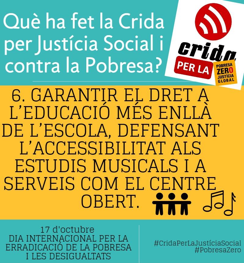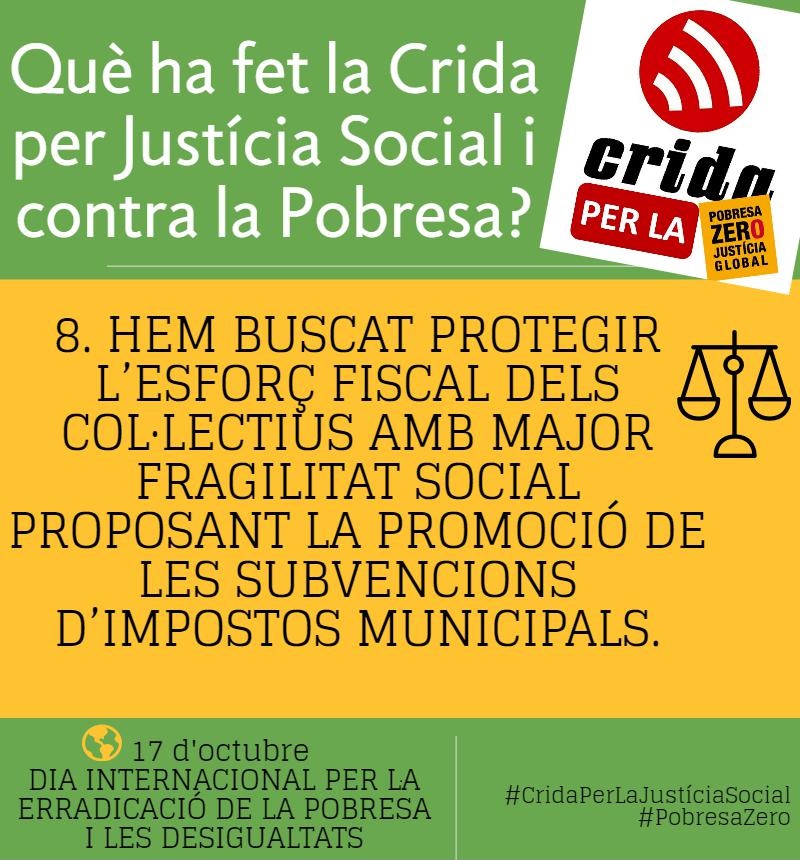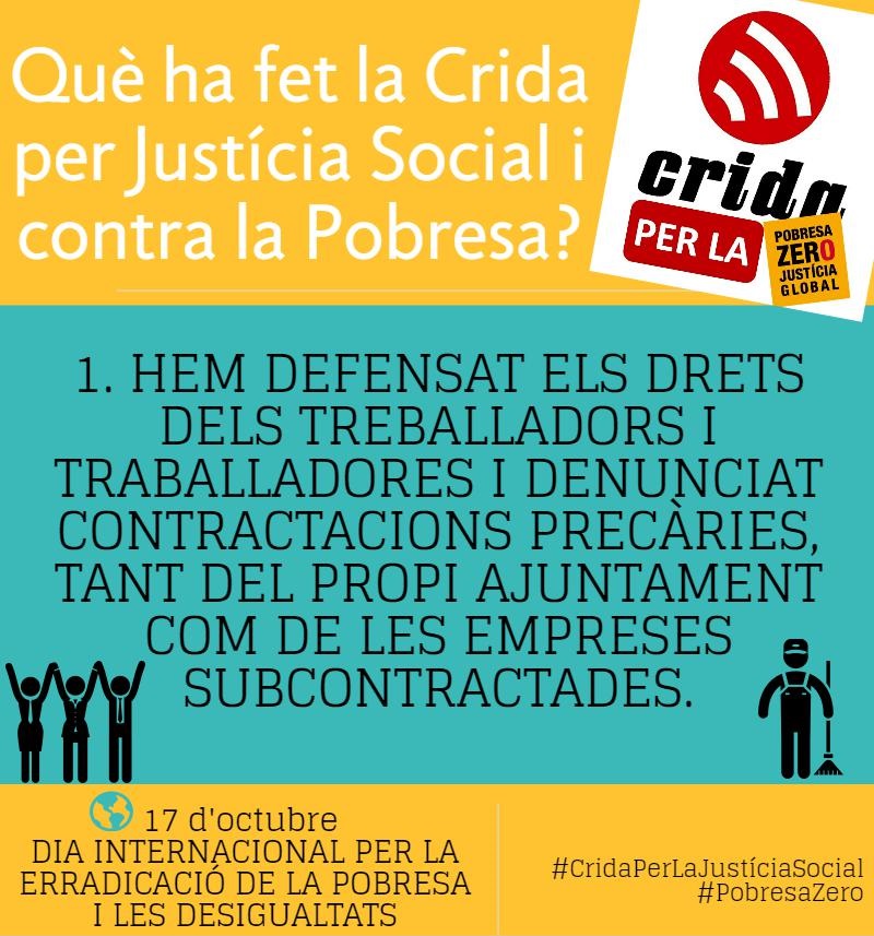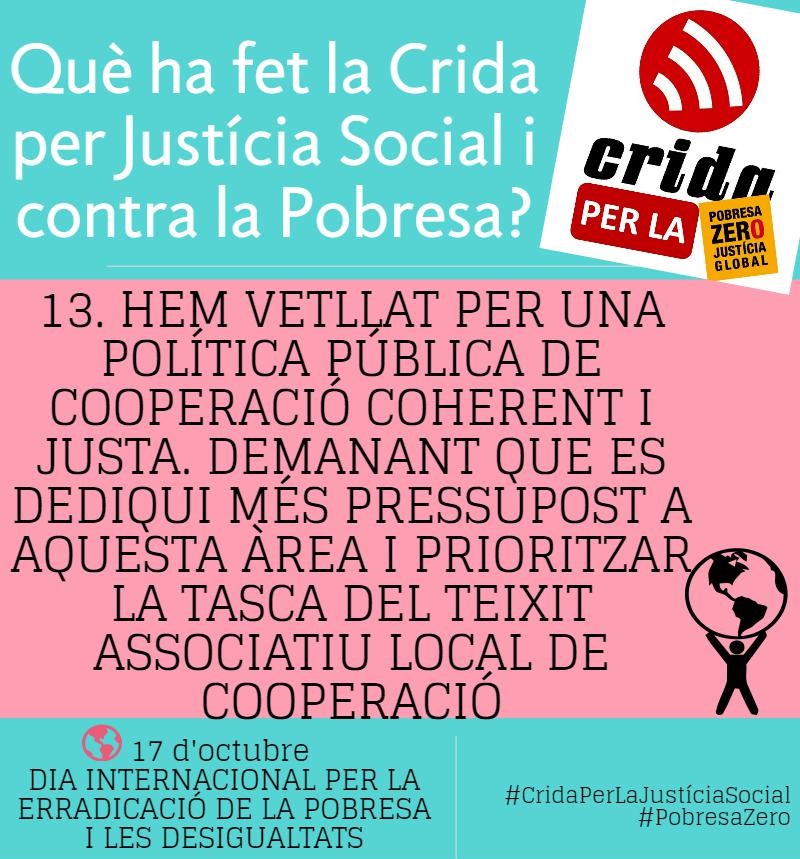 El 17 d’octubre va ser el el Dia Internacional a favor de l’Erradicació de la Pobresa. Amb aquest motiu ja fa anys que es realitza per aquestes dates la Campanya Pobresa Zero-Justícia Global moguda per diverses institucions i agents de la societat civil. La seva intenció és reivindicar la lluita contra la pobresa en totes les seves formes, la reducció de les desigualtats socials i la construcció d’un món més equitatiu i just. El lema d’aquest any és “12 Fronts, 12 mesos després. Es redueixen les desigualtats?”, ja que l’any passat es van acordar unes mesures recollides al document “12 Fronts de Lluita contra lesDesigualtats!”